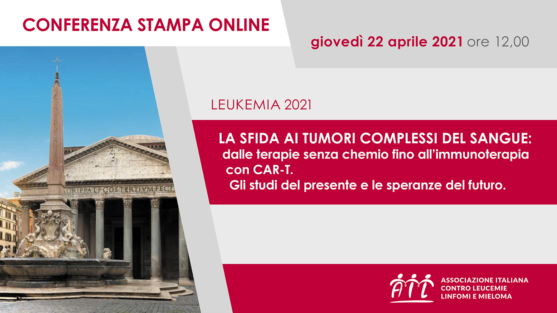 AIL ha sostenuto negli anni centinaia di progetti di ricerca attraverso la raccolta di fondi investiti per finanziare lo sviluppo di nuove terapie che hanno rivoluzionato l’Ematologia. L’Associazione ha costruito insieme ai volontari, ai ricercatori e ai clinici un futuro migliore per i malati. Oggi i pazienti affetti da leucemie, linfomi e mieloma possono contare sempre più spesso su un domani libero dalla malattia e sanno di poter tornare a una vita il più possibile normale. Tutto questo grazie al sostegno di AIL e ai poderosi progressi della ricerca scientifica di cui si parlerà durante i lavori del Convegno.