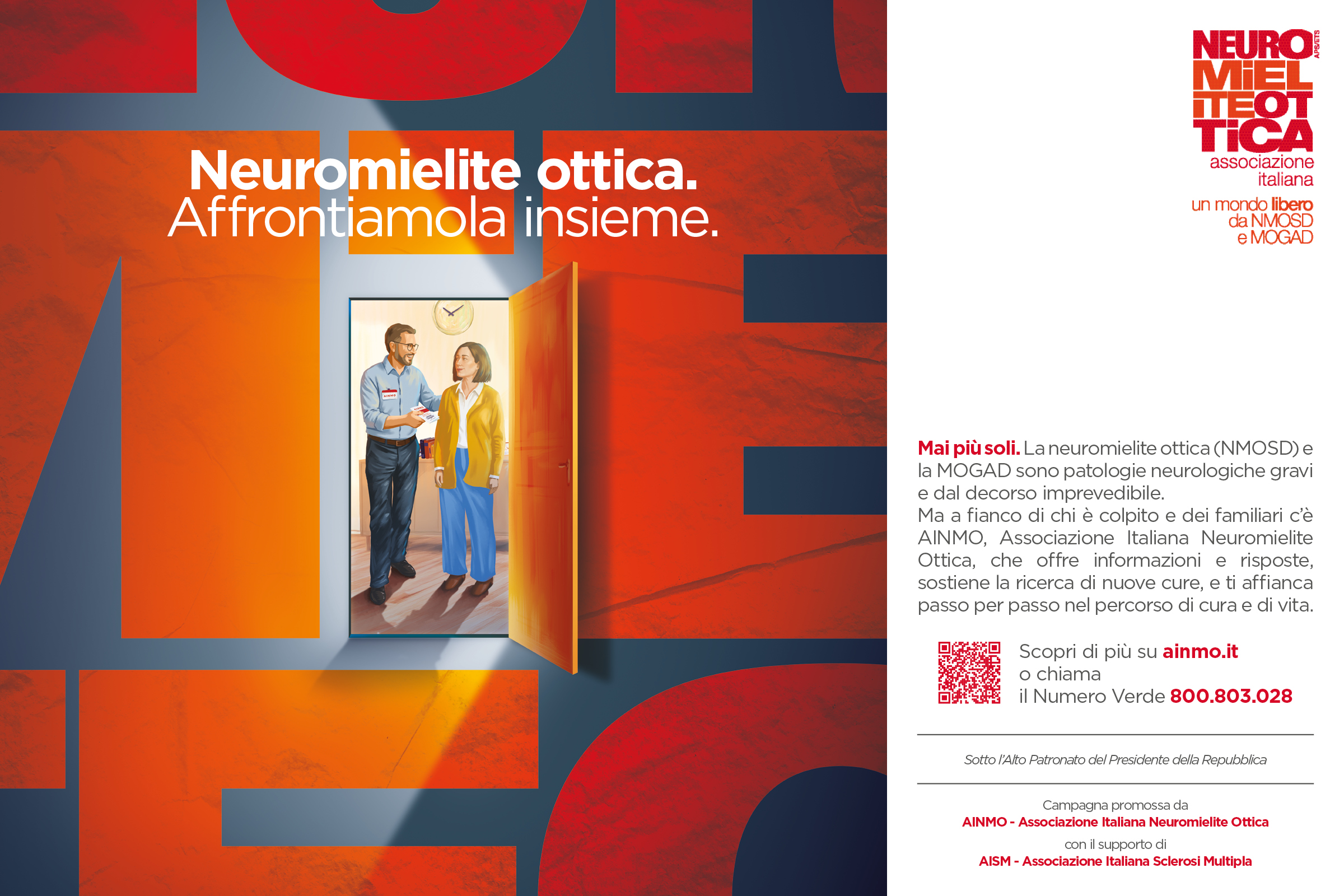 Il visual mostra una porta che si apre: oltre la soglia, una donna con neuromielite ottica è affiancata da un volontario dell’associazione. L’immagine richiama un momento cruciale – quello della diagnosi – ma anche l’ingresso in una rete di supporto.