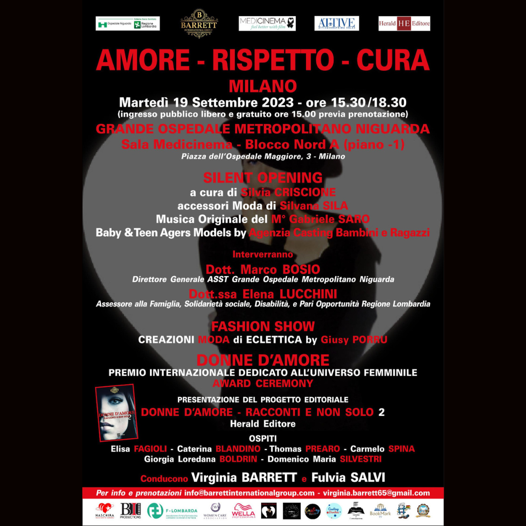 Martedì 19 settembre 2023 a Milano, in apertura della settimana della Moda, dalle ore 15.30, presso il Grande Ospedale Metropolitano Niguarda nella sala Medicinema, si svolgerà l’evento “Amore – Rispetto – Cura”, dedicato alle donne in terapia oncologica, promosso da Medicinema Italia ETS, l’unica organizzazione nazionale riconosciuta per l’utilizzo del cinema e dell’arte a scopo di cura, e dall’Associazione Naschira partner di Barrett International Group di Virginia Barrett che realizza eventi a favore delle donne, in collaborazione con l’Associazione Attivecomeprima, impegnata da tempo nel sostegno di persone malate di cancro e dei loro familiari, e con Herald Editore.