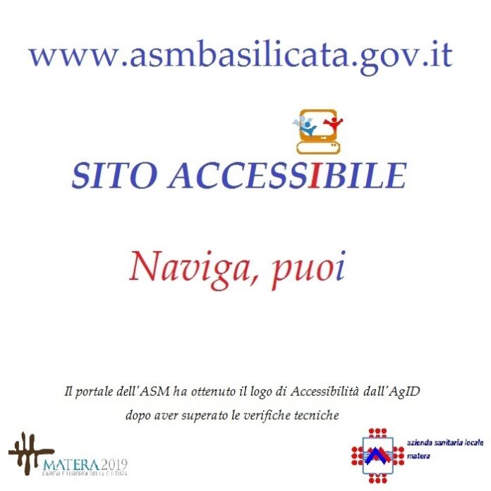 L’U.O.S.D. Comunicazione-U.R.P.-Ufficio Stampa-Privacy’ dell’ASM di Matera ha ottenuto dall’AgID, Agenzia per l’Italia Digitale in capo alla Presidenza del Consiglio dei Ministri, il rilascio del logo di Accessibilità da esporre sul portale aziendale. La procedura attesta il superamento delle verifiche tecniche di accessibilità dei requisiti previste dal Decreto Ministeriale 8 luglio 2005. Un’applicazione web dedicata gestisce l’esposizione del logo di accessibilità sui siti web che hanno superato con esito positivo le verifiche previste dal Decreto Ministeriale 8 luglio 2005. Questo risultato rappresenta un incentivo nel proseguire le attività di rafforzamento dei requisiti di accessibilità e non certamente la conclusione di un percorso avviato qualche mese fa con il video interpretariato in LIS per utenti sordi. L’Azienda Sanitaria di Matera intende, infatti, camminare su questo terreno implementando le tecnologie assistive per garantire a tutti, anche attraverso gli strumenti di informazione e comunicazione istituzionali, le risposte ai bisogni e alle domande di salute che giungono anche via web.