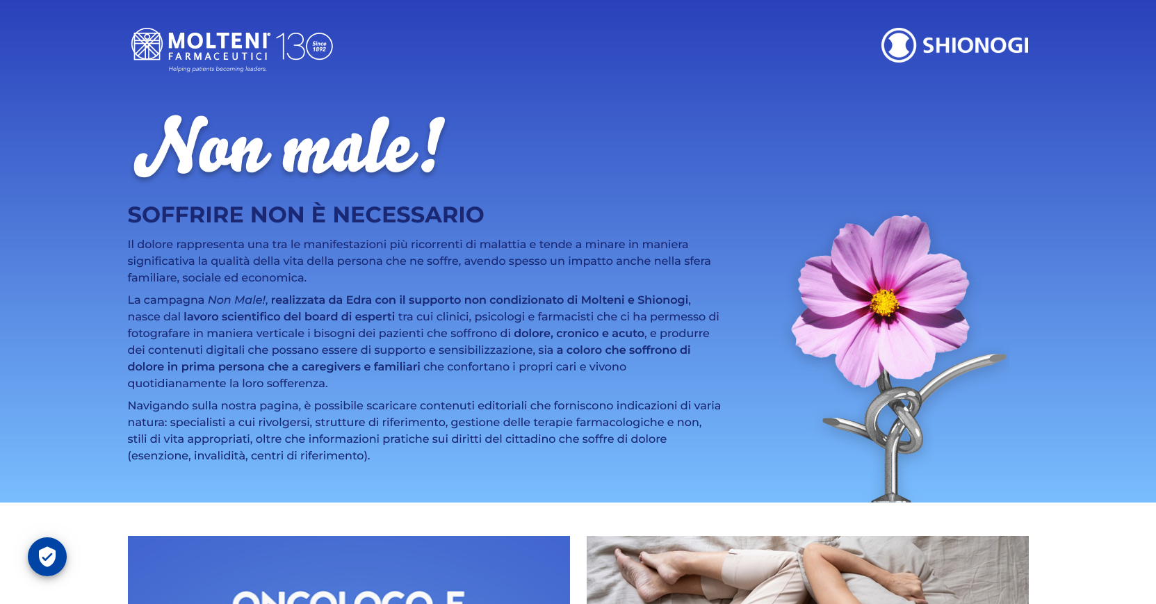 L’iniziativa, organizzata da Edra, con il supporto non condizionato di Molteni e Shionogi, ha preso il via in primavera con la realizzazione di contenuti informativi e di sensibilizzazione rivolti ai cittadini, tra cui una piattaforma web, le pagine social dedicate e il fascicolo “Non male! Indicazioni pratiche per conoscere e gestire il dolore cronico”. Il documento, definito a seguito dell’analisi dei risultati di una survey condotta su 1.688 persone che soffrono di dolore o che assistono chi ne soffre, è stato elaborato grazie al contributo dei principali stakeholder in ambito scientifico e realizzato con il patrocinio di FADOI, SIGG, SIOT e Fondazione ISAL – Ricerca sul dolore.