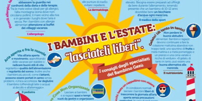 Al mare, in montagna o in città, il vademecum degli esperti dell’Ospedale Pediatrico Bambino Gesù per affrontare con serenità l’estate in compagnia dei propri figli. Tanti i consigli per i genitori: dalle punture delle zanzare a quelle delle meduse, dall’alimentazione all’abbigliamento. E poi ancora i suggerimenti su come affrontare il mal d’auto.